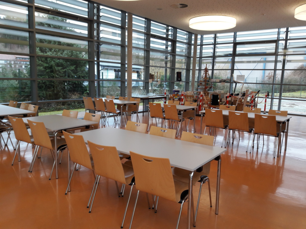 Im Speisesaal wird aber nicht nur gegessen, sondern mit einer Bühne und Beamern findet der moderne Saal vielfältige Verwendung für Auftritte unserer School of Rock, Lesewettbewerb usw.